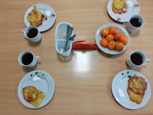Поэтому полдник в нашей школе всегда представлен, как вкусный и питательный перекус, в виде вкуснейших блинчиков «Банановый рай» и оладий со сметаной, пиццы Школьной, пирожков со сгущенным молоком, ароматных ватрушек, бутерброда. Каждый полдник дополнен горячим напитком- чаем, какао, кисель или компотом, соком, а также свежими фруктами.